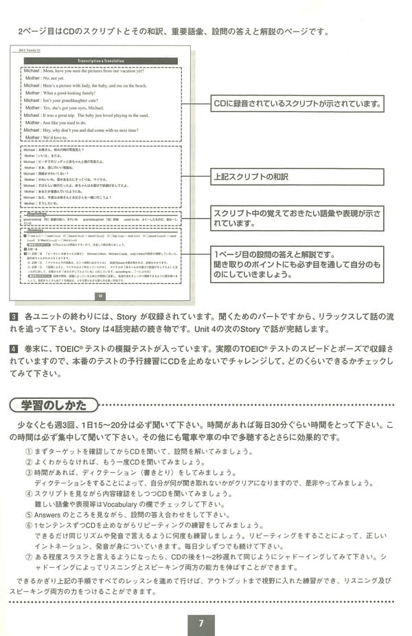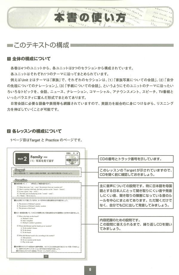 週3回、1日わずか15分で速聴力が身につきます! 英検、TOEICテストの模擬テスト&解説付で資格試験対応もバッチリ! テキストを1冊終えるごとにachievement testで実力を確認できます! リスニング力だけでなくスピーキング力アップの問題も充実!意識しなくても確実に会話力をつけることができます! 題材も身近なことから興味深い話題を幅広く取り上げているので飽きることなく続けられます! 単に正誤の聞き取り問題だけではなく文意を聞き取るための穴埋め式の問題や 文脈から意味を推測するボキャブラリー問題など多様な問題を取り揃えてあり 一人で学習しても飽きない魅力ある充実した内容になっています! ※2003年 初版 ■CD5枚+冊子5冊 ■「リスニングの達人」シリーズ トピック [1] 仕事、映画、音楽、余暇、旅行、健康、夢、行事など [2] 家族、スポーツ、海外旅行、会社、仕事、将来、感情、娯楽など [3] 食事、職業、娯楽、休暇、ニュース、日本、ホームステイなど [4] 宇宙、スポーツ、政治、詩、コマーシャル、スポーツ中継など [5] ゴシップ、政治、仕事、興味、夢、愛、教育、環境、伝統、医療など [6] 映画、恋愛、芸術、宗教、心理学、ビジネス、法律ボランティアなど