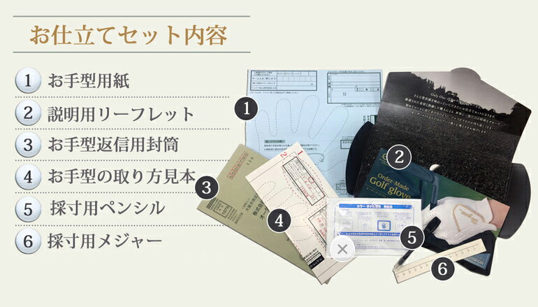 ▼商品名オーダーメイドゴルフグローブお仕立券(プラチナギフト)▼お仕立てセット内容1、お手型用紙×12、採寸用ペンシル×13、採寸用メジャー×14、お手型用紙の返送用封筒×15、説明用リーフレット×16、手型発色液×1▼ゴルフグローブ仕様(プラチナ)素材:天然羊革カラー:ホワイト・ブラック・レッド・キャメル刺繍糸:銀色※内容・デザインなど変更になる場合があります。