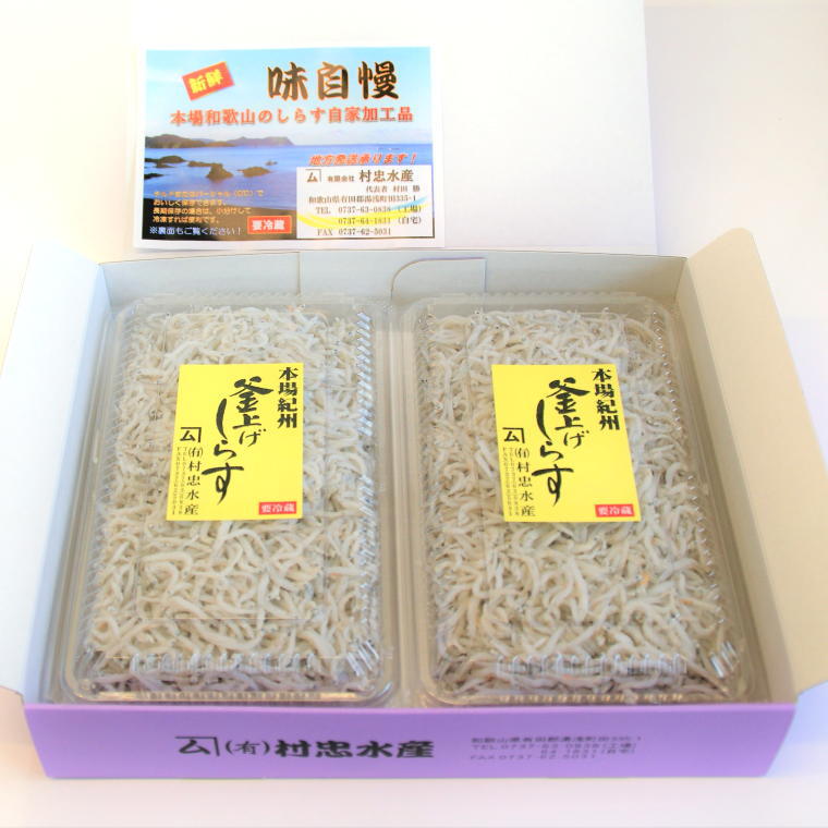商品詳細 名称 和歌山の海の幸を冷蔵にてお届け!「新鮮釜揚げしらす」700g(350g×2パック入) 生産地 和歌山県湯浅町産 内容量 1箱700g(350g×2パック入り) 賞味期限 5日(冷蔵4度以下で保存した場合)※保存状態にもよりますので、目安とお考え下さい 配送方法 冷蔵 商品概要 黒潮あらう紀伊水道にて自社の船で漁獲し、自社の加工場で釜揚げした新鮮しらすです。